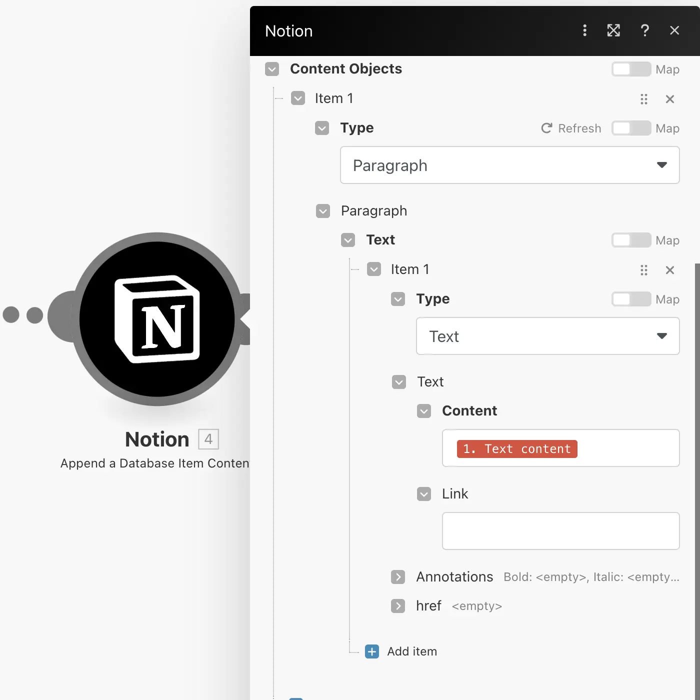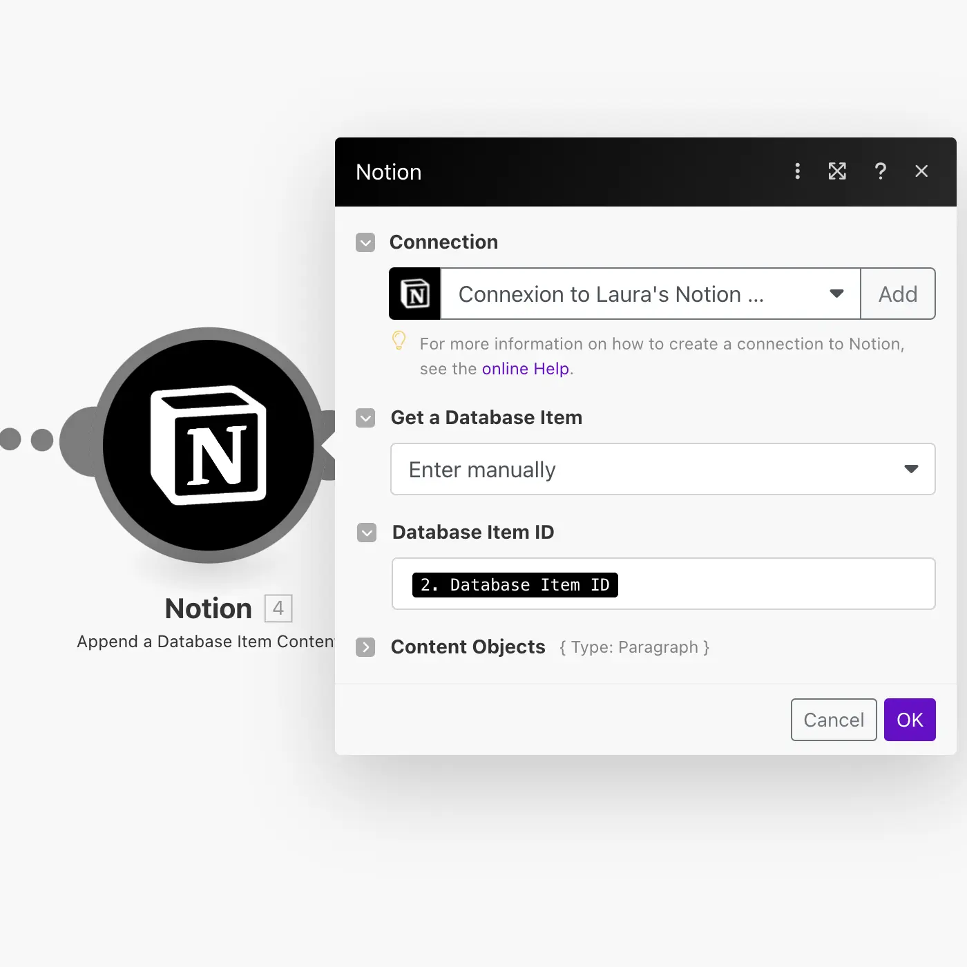 - Add another module for Notion, but this time choose Append a Database Item Content.
